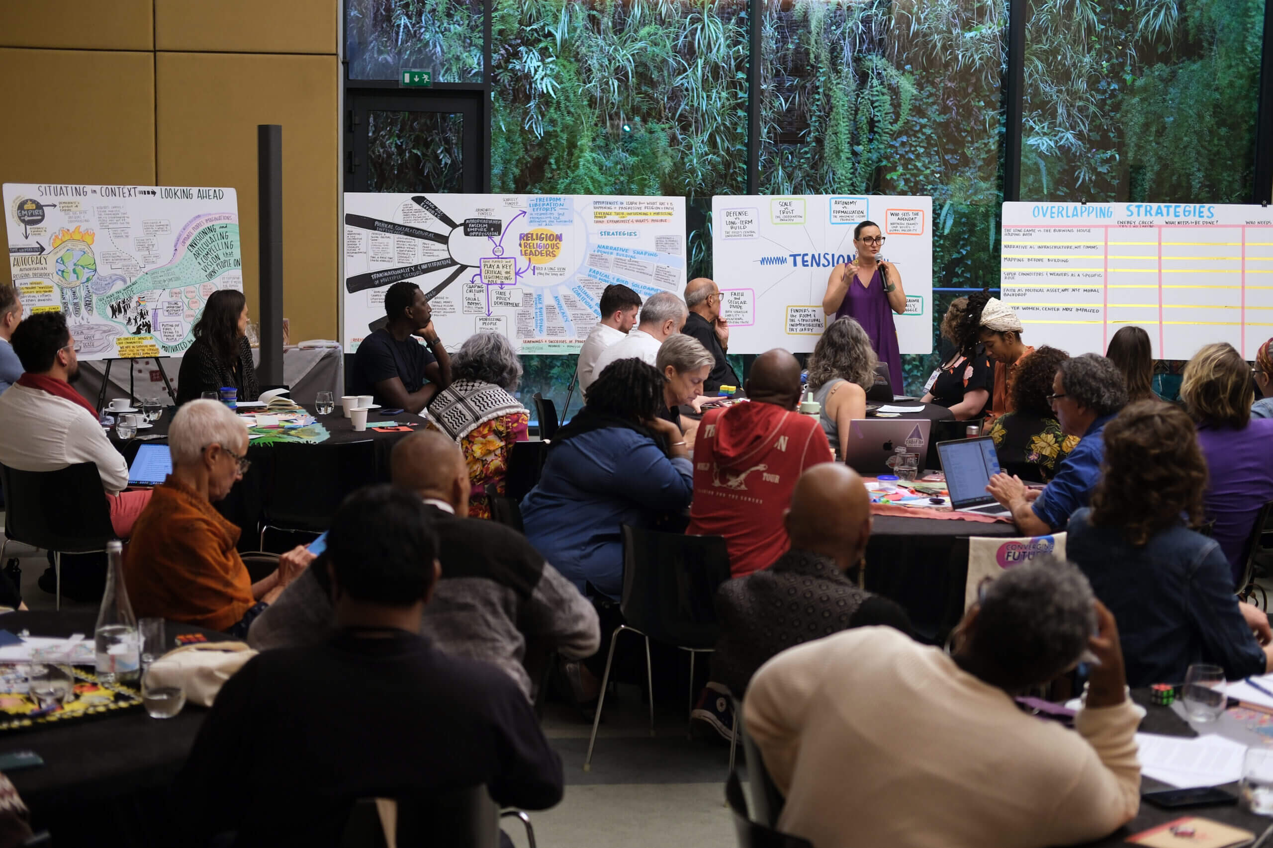 Convening facilitator Angelika Arutyunova cultivated this creativity by inviting participants to connect with one another through art. Each day started with somatic movement practices and often poetry. Claudia Lopez, a graphic illustrator, captured participant reflections in real time through huge drawings that mapped collaborative thought.